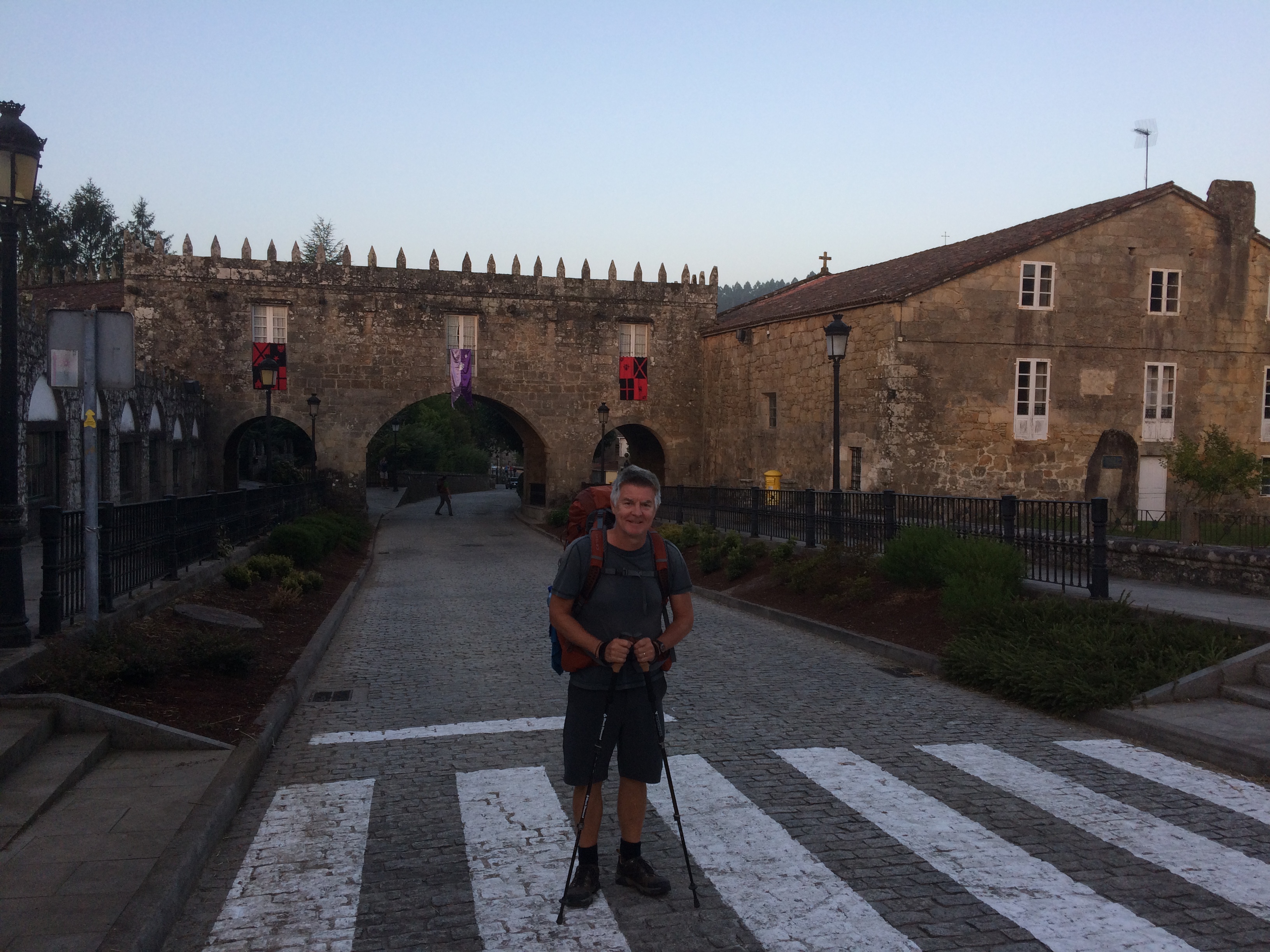 Anyway, we set the alarm for 7am today and, after some initial confusion about whether we were setting off early to beat the sun or having a rest day, we hit the road just after 8am. On the way out of town we were rewarded with a great view over the town and valley just as the sun was rising (even the sun is up late in Spain!) A beautiful morning with a light fog and a great section through forest past Zas and A Peña, where we stopped for a coffee. After another hour, but more roads and less shade we arrived at Vilaserio, where we had a water before setting off again. The sun was really starting to get some bite into it as we shifted from mostly forest to mostly road and by the time we hit Santa Mariña just before 2pm it was 35c in the shade. This had been our target for the day – our accommodation for the night is off the Camino so we had to call them for a pick up anyway, so we had a couple of waters and a sandwich (ok – I had one beer as well!) and called it a day. Bit of a stuff up when we did arrive at our hotel, Casa Jurjo, where they had no reservation for us (glad they didn’t check before picking us up!) but they had rooms so no problem on the end. It is a bit disconcerting though to have that seed of doubt about whether you have a room for the night while walking during the day…
