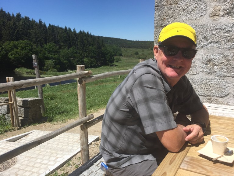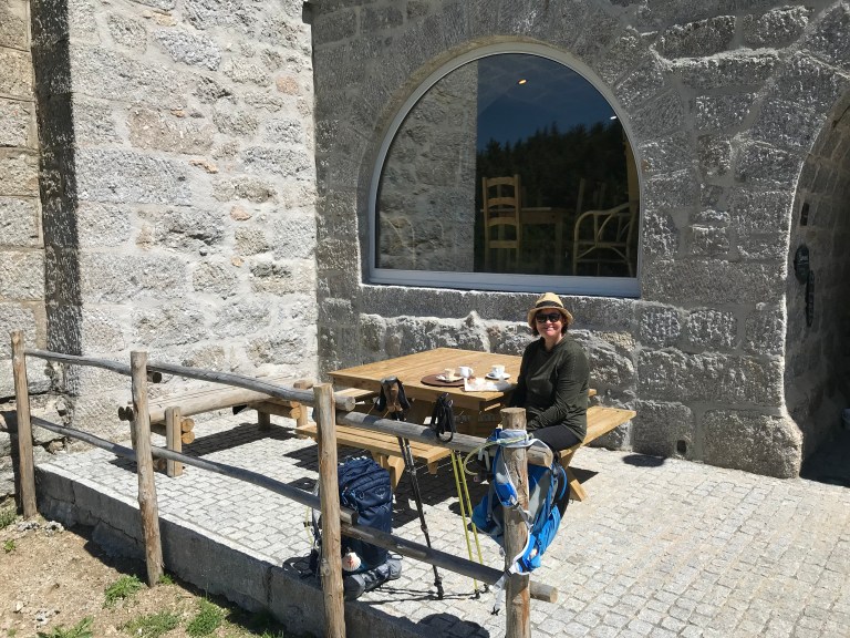 We had a much better day today, with mostly flat, mostly good roads and tracks underfoot, travelling 6kms or so through the gently undulating valleys of the high country known as the Massif Central. Overnight the temperature dropped quite low and we started in 4C but brilliant sunshine and fantastic conditions! The scenery was quite spectacular and we passed through a few hamlets, Le Falzet and Villeret-d’Apcher with a spring in our step, all at around 1100m. At Contaldes we decided to take a detour of about 800m to the pretty village of Chanaleilles for a coffee break, which was very nice, adding about 1.6km to our journey. Although we enjoyed it, in retrospect it was a bit of a mistake as we passed a (better) cafe/snack bar about 800m after rejoining the GR65 and by the end of the day we could have done without the extra kms!