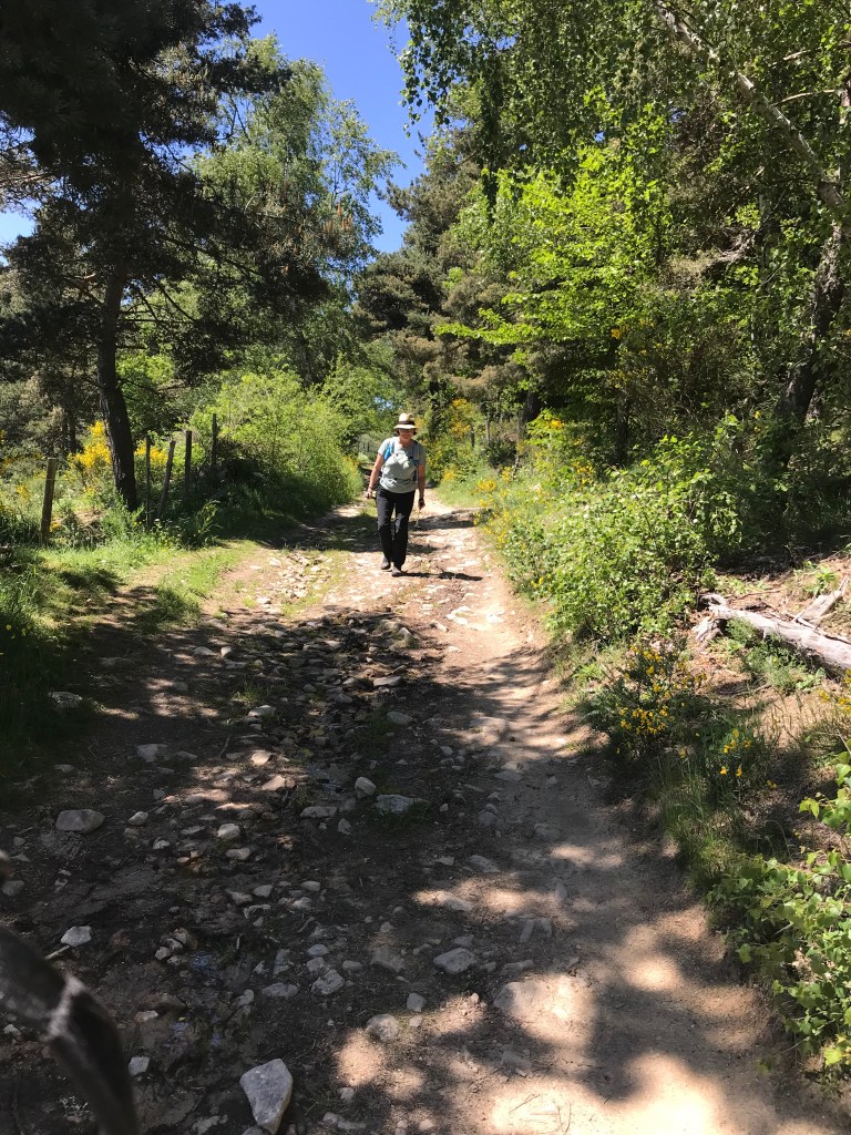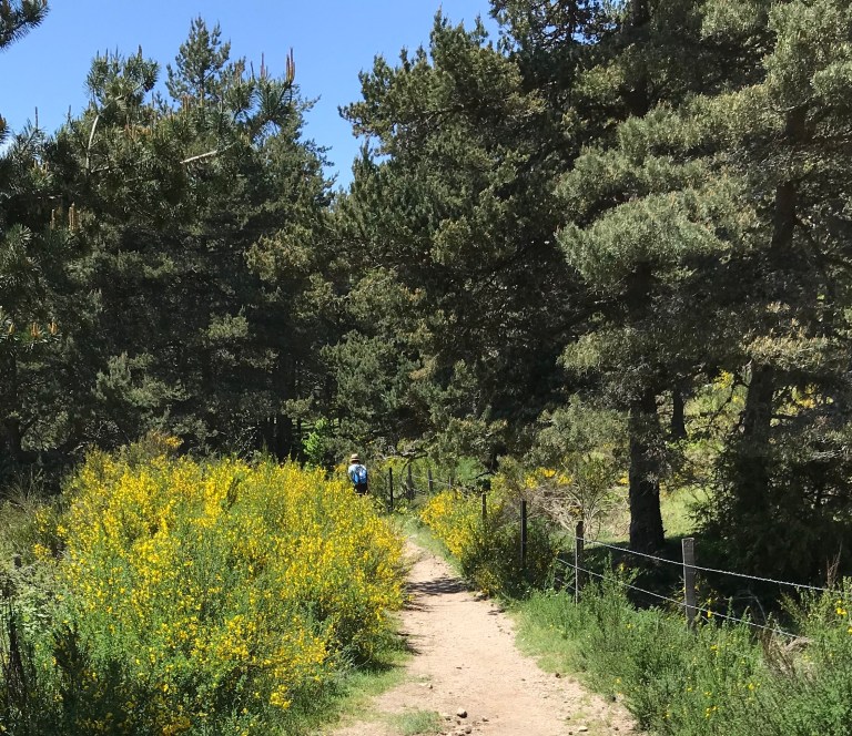 The terrain between Contaldes and, much later, Le Rouget was very different from the lush green valleys we had been encountering. First we walked through pine forest, with clouds of pollen flying around in the fairly stiff breeze, then through scrub above the forests. It seemed to take an eternity to travel the 9.5km from Domaine to Le Rouget, not least because the signs kept showing much longer distances than my calculations! In this stretch we passed from the Haute-Loire department into the Loziere department and the standard of infrastructure for walkers, which had been excellent, seemed to drop off.