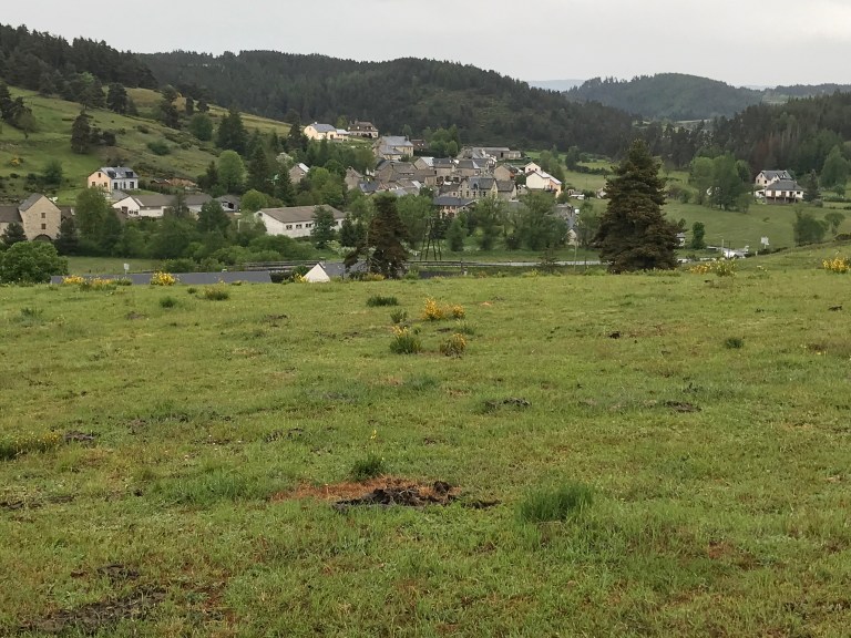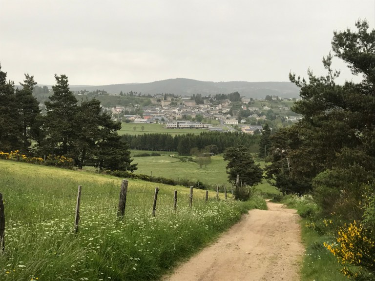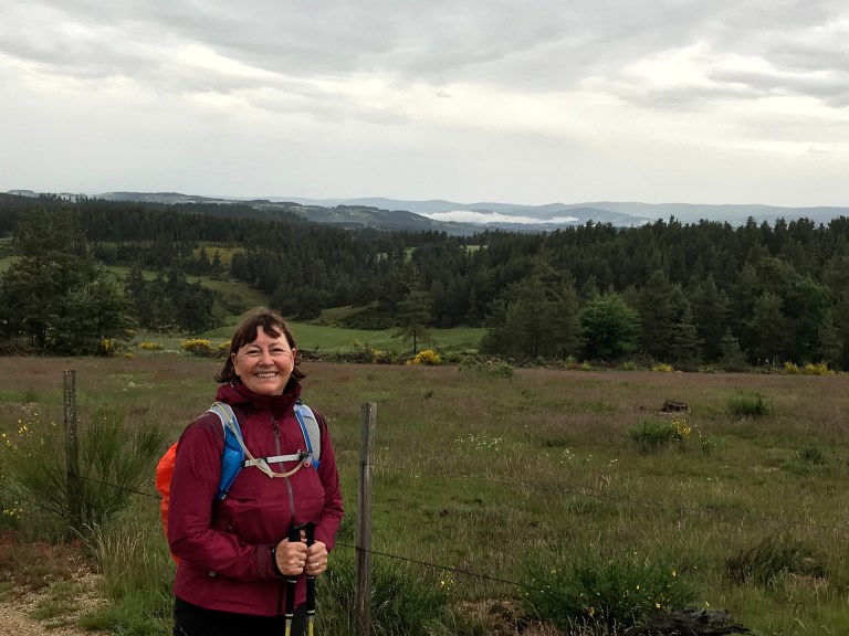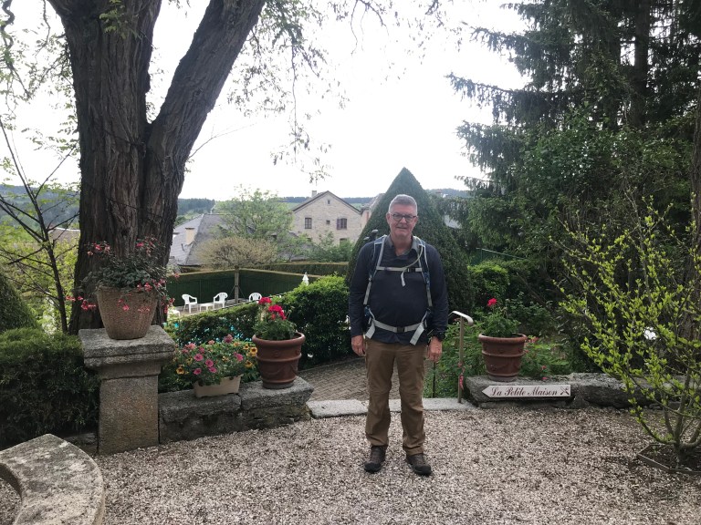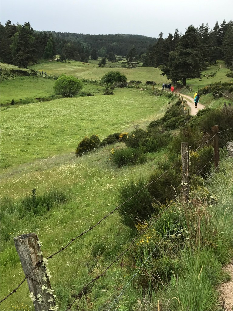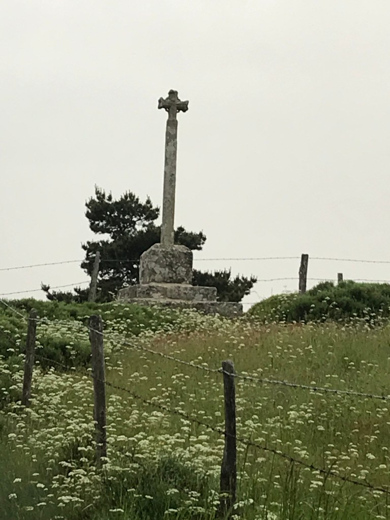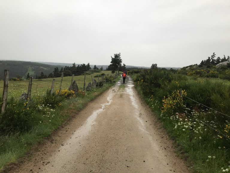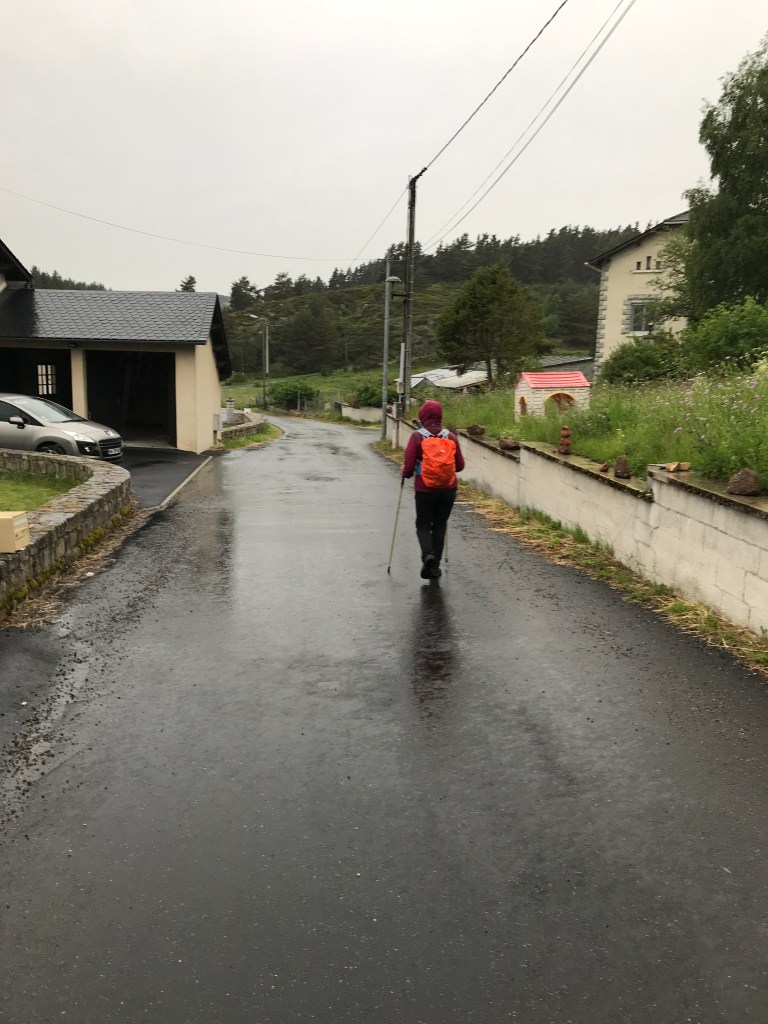 The early part of the walk was out past the sports grounds of the town and then an up and over (the up seems to be mandatory again) to the village of Grazières-Mages (don’t ask me why the town names are all double bangers!) where the rain started to increase. There is a picture of a cross on top of the hill before Grazières – they have been common appearances along the trail and apparently they mark the site of a local shrine or pilgrimage.