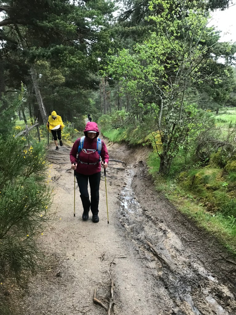 We passed a small village about 4km from the start of the day and then emerged back into similar country to yesterday at about 1100m – only this time wet! Finally, after about 7.5km from the start, the rain started to slow up and we dropped down into the village of Les Estrets – you can see the small church and graveyard. We could have done with a break but nothing was open and, although the rain had stopped, everything was wet. We’ve brought two lightweight chairs with us but up till now there have been plenty of covered and uncovered rest stops so we packed them in our suitcase today to reduce the amount of gear that got wet: we really could have used them today so they’re staying on the pack from now on!