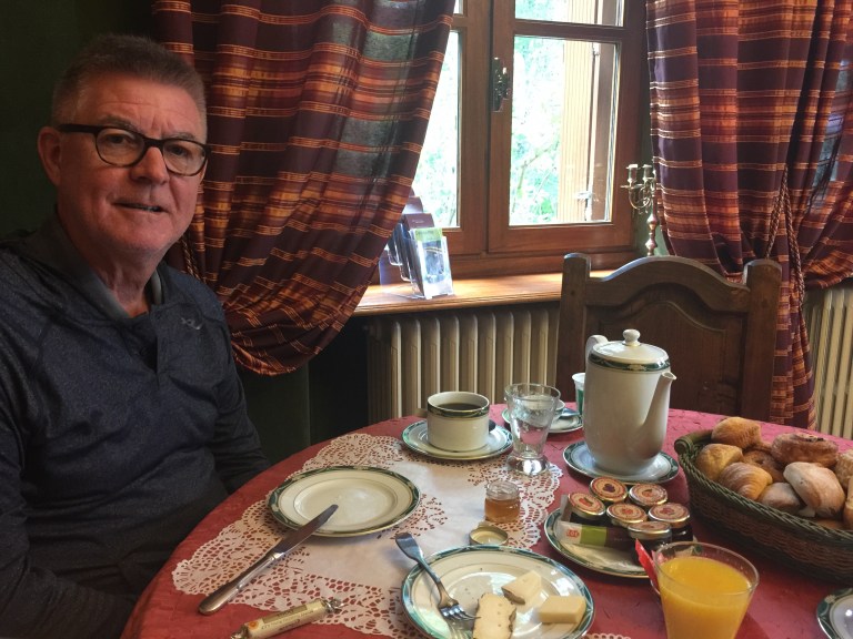 Our hotel last night was very interesting – basically an old couple in what amounted to a museum. We (thought we) only had a short walk today, so we slept in a bit and had breakfast around 9am – very French with lots of bread and pastries – and got away around 9:45 am. Rain was forecast in the morning and late afternoon and before we even left the hotel grounds we had our pack covers and rain jackets on. Not enough rain, we thought, to warrant the full ponchos.