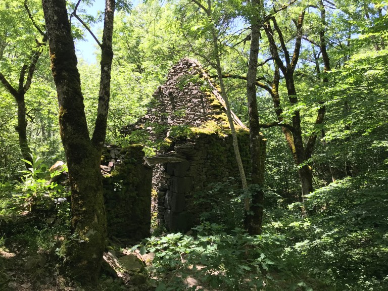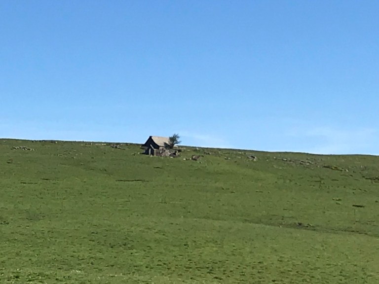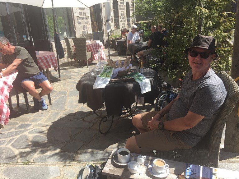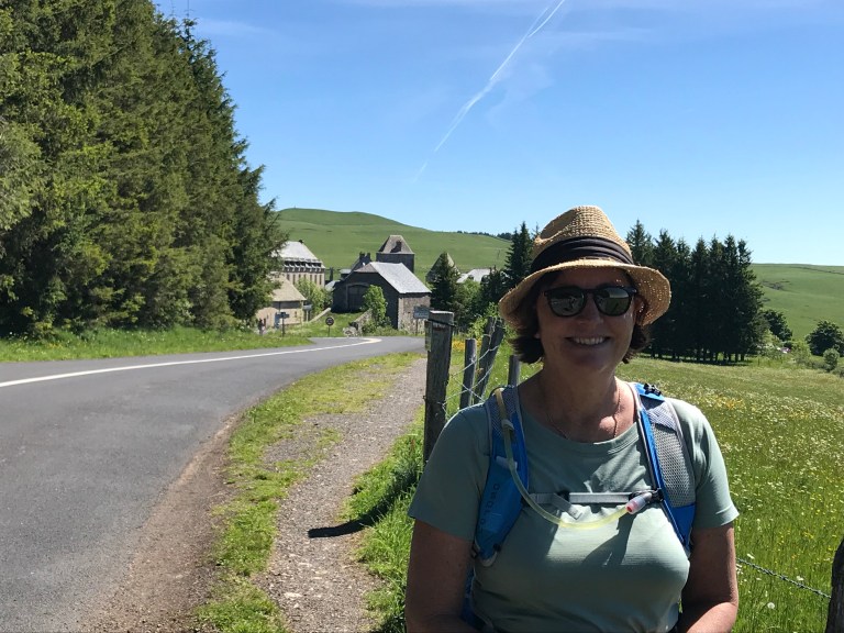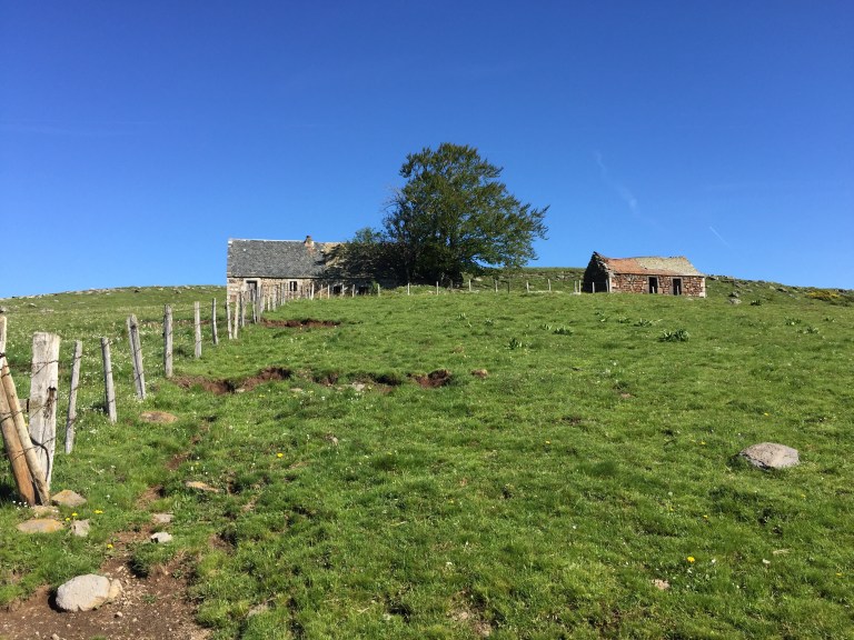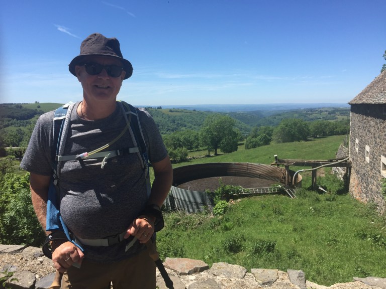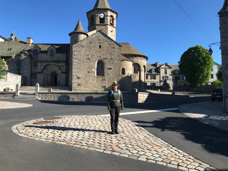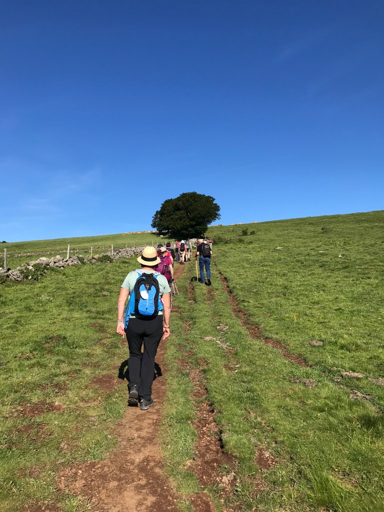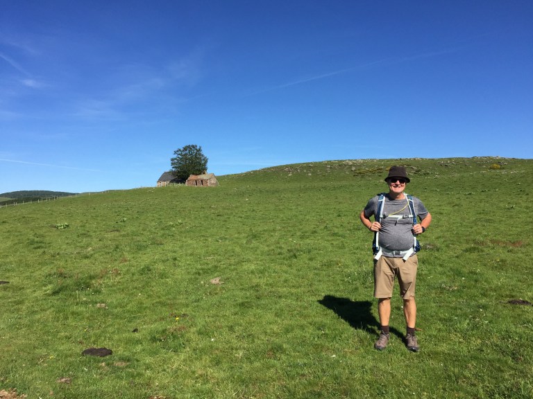 After a much quieter breakfast than yesterday, we set off about 8:30am into town, where we bought some quiches for lunch, and made good headway for the first 9 or 10 kms to the village Aubrac (Aubrac is both the name of this tiny village and the greater region, hence the name Aubrac appearing in many of the towns we are visiting!), where we stopped for a coffee around 11am. The track was really good underfoot, sealed and dirt roads for a while then really nice tracks through farmland. You can see a few “burons” in the photos – these are the huts that shepherds used to stay in for the summer while the herds and flocks were up on the plateau. You can also see that in this section the trail was really busy – for the first couple of days we thought the trail was fairly quiet, but now we are starting to pick up groups that either missed the first two stages or are bussed in to walk maybe 10kms of the best sections then head off to another section.