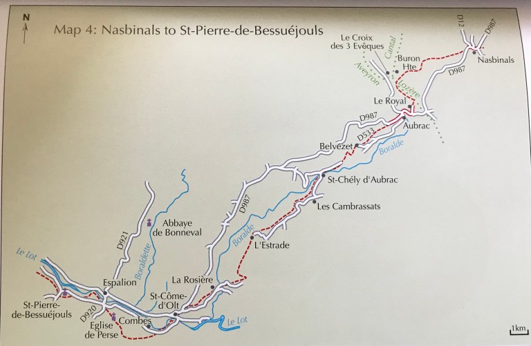 Just prior to Aubrac we passed the highest point on our walk, 1368m, which was not much higher than Nasbinals (at 1180m, the highest town we will stay at). We also passed from the department of Lozère to Aveyron.