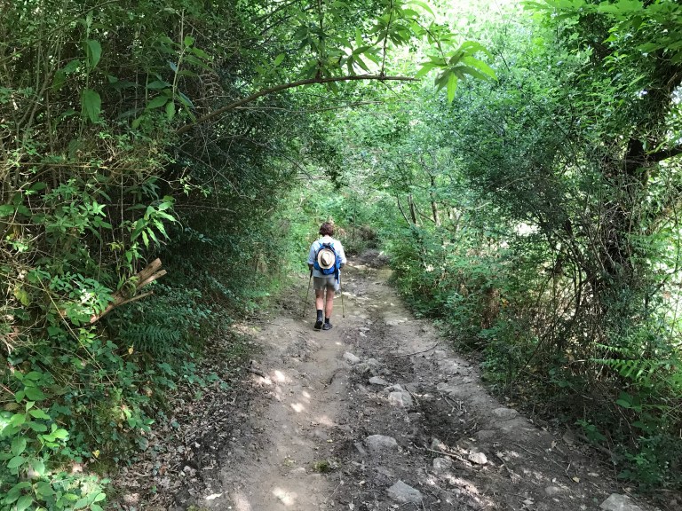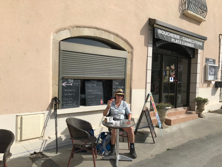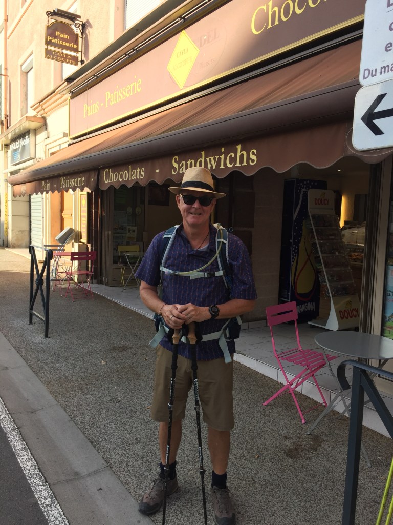 We expected and got hotter temperatures today – about 32C maximum – but couldn’t get away early because breakfast wasn’t till 7:30am and then we had to get dropped into town. The grocery store the guy dropped us at wasn’t open so we had to walk a bit further into town to the patisserie to get some lunch, so it was about 8:20am before we got walking.