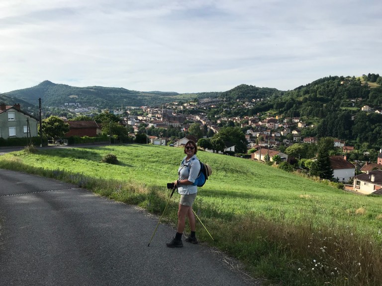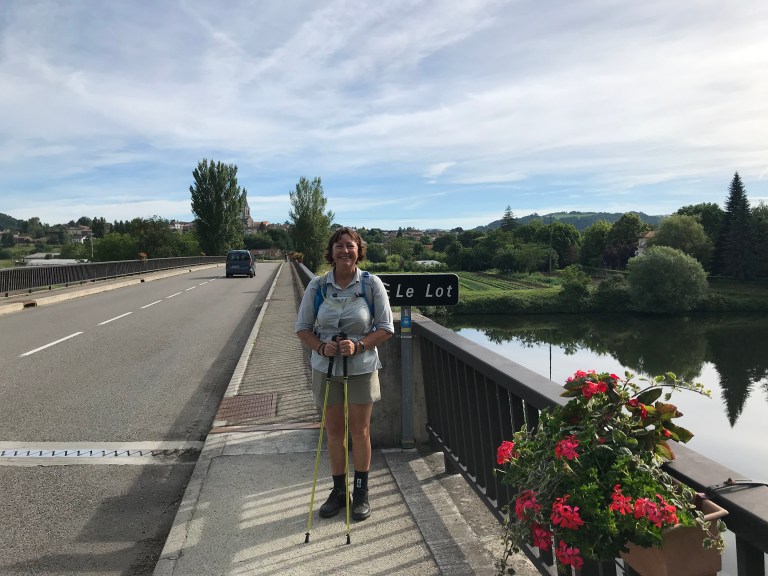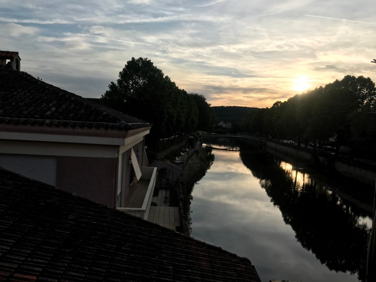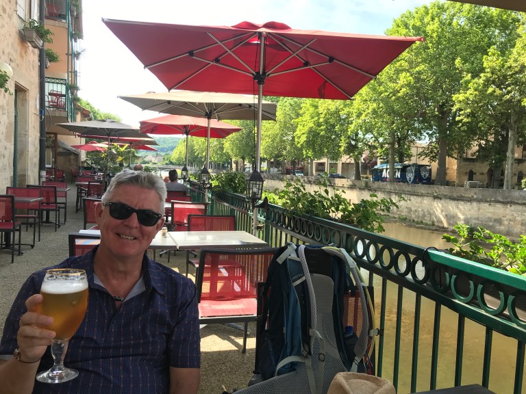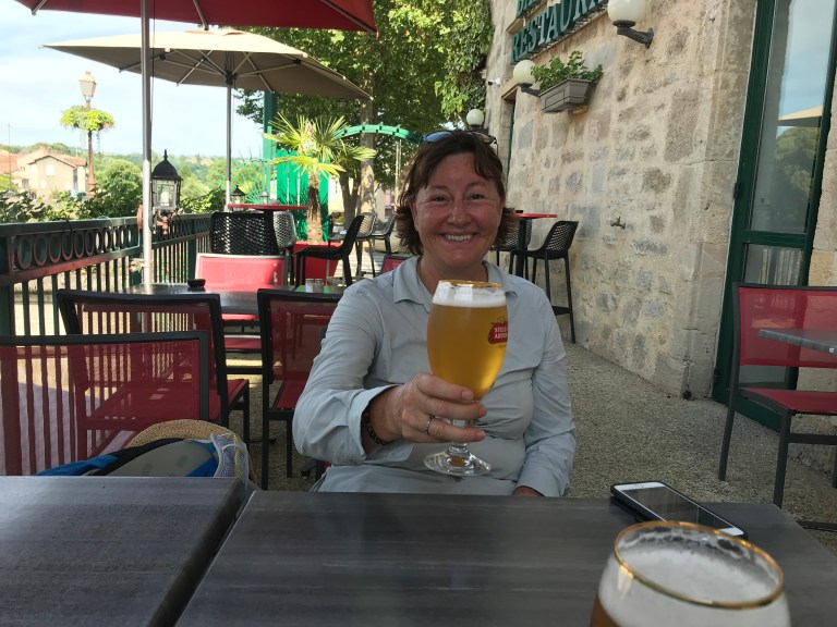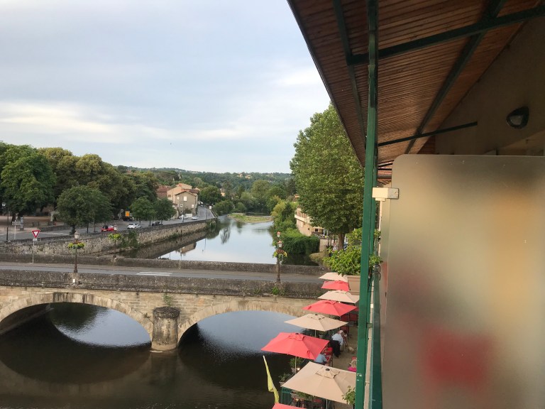 The descent into Figeac was long, steep at times and hot but we finally got into town around 5:40 pm – first stop a beer and then checked into our room (which was a bit pokey, so we upgraded to a river view!)