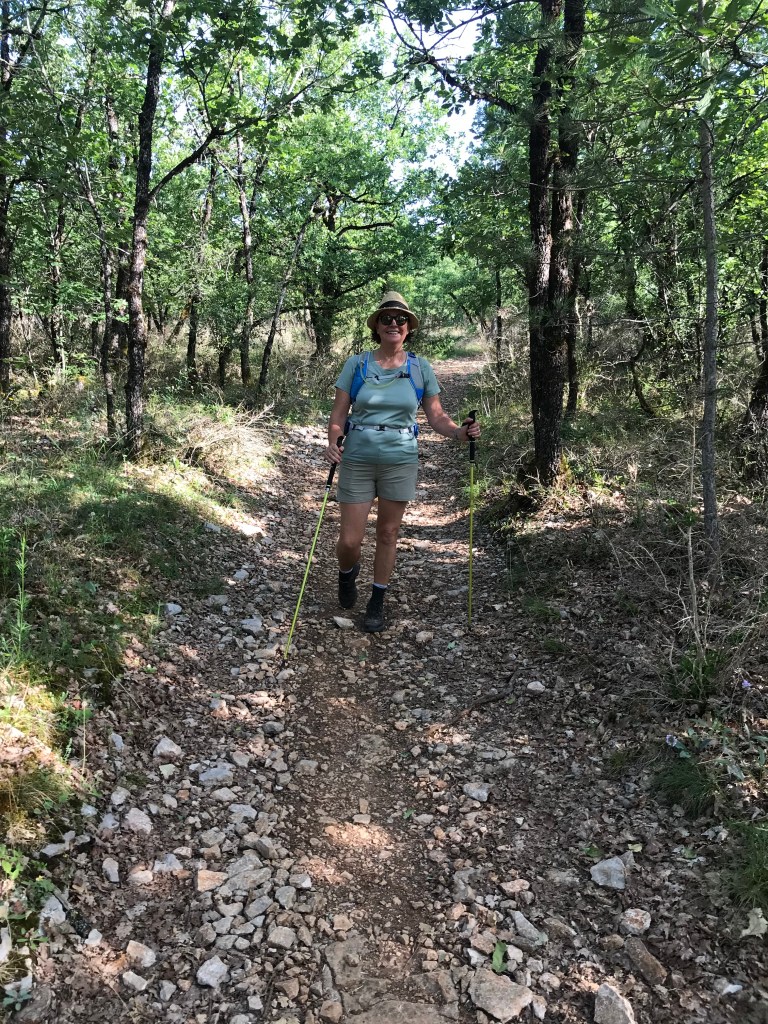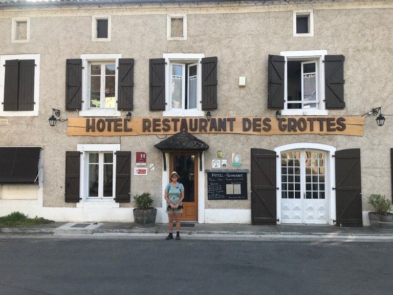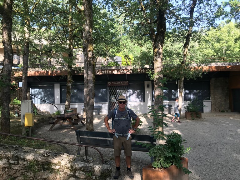 The walk from Bouziés to Saint-Cirq was also very pleasant – mostly shady and mostly flat until the last 400m which rises 100m to the village of Saint-Cirq. By now things had heated up and we were wet through from sweat- fortunately our hotel was about 40m from the top of the trail, and even more fortunately our room was ready for us on our arrival around 11:30am.