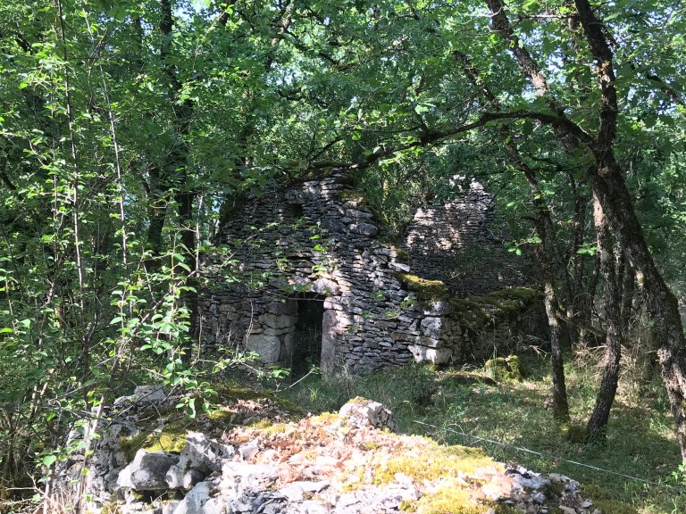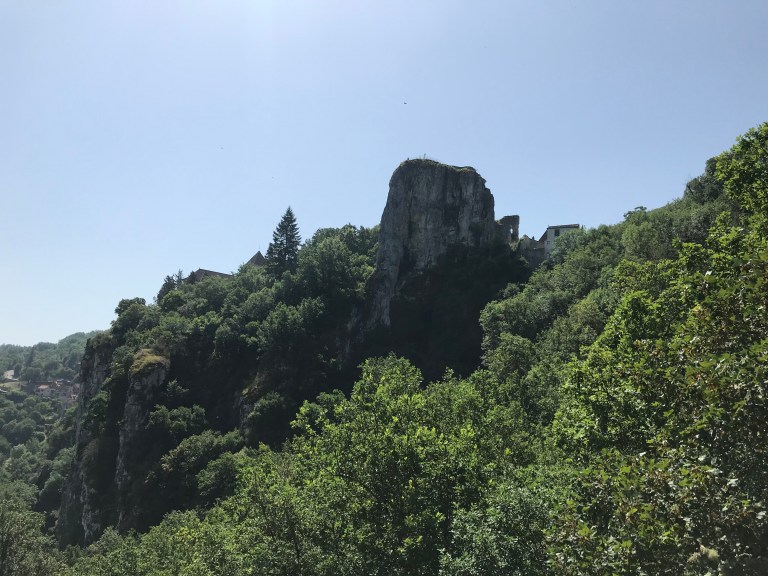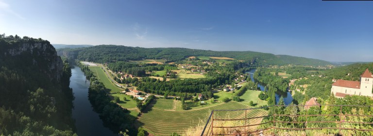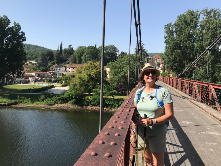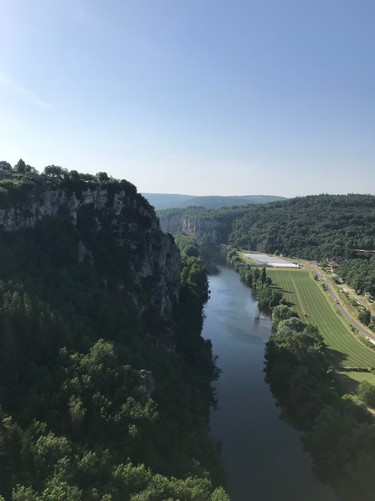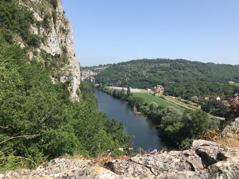 We got away today just before 8:30am, with the air still cool and nice breeze. As usual, we hiked up the hill, past the church and then a cave called the Pech Merl, which has ancient paintings in it. Once we reached the top we had a very nice walk through forest in fairly cool conditions, passing the junction of the Célé and the Lot rivers and leaving the Célé valley after an hour and a half or so and then on to the town of Bouziés where we had a short break. The GR651 finishes at Bouziés and we joined the GR 36-46, which follows the Lot valley.