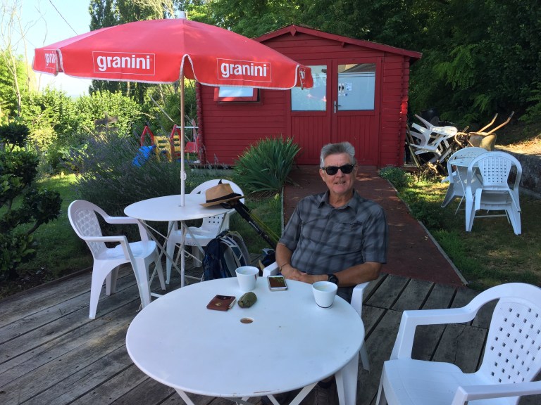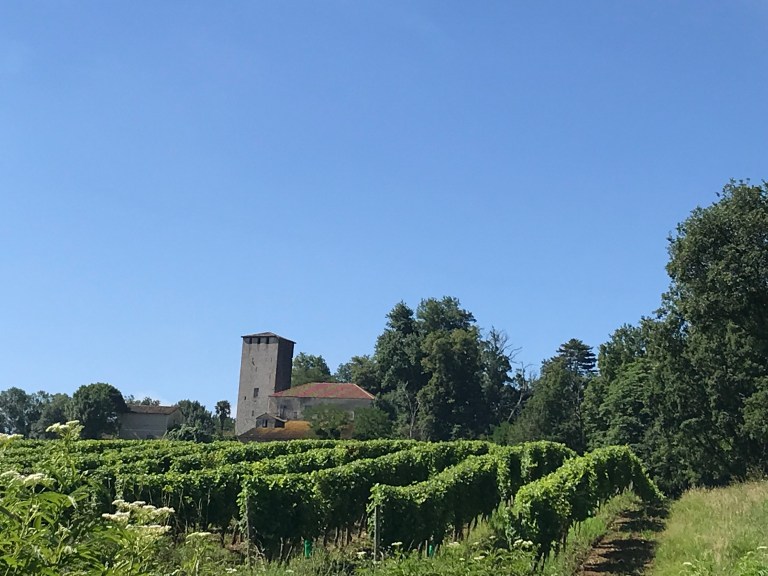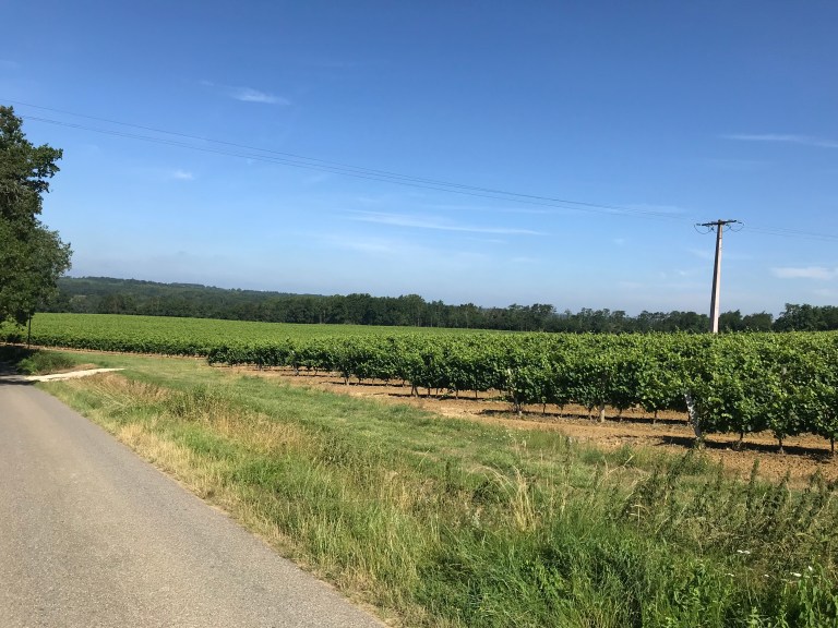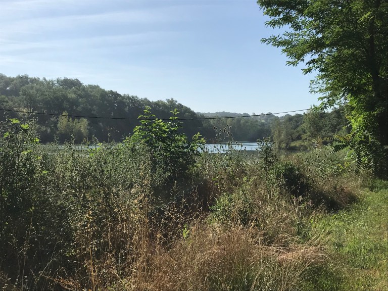 Once again, we set off at a leisurely 8:40am, probably in more sunshine than we had anticipated but still pretty cool. We walked the 500m or so into town (for the third time!), through it and then ascended down to the Gers river and walked in shade alongside but not in sight of the river along great roads for nearly 2 hours before abruptly turning back on ourselves near the lake in the photos. From there to La Motte, where we stopped for a coffee just over 9kms into the day it was vines, vines and more vines, mostly above head height so few opportunities for photos.