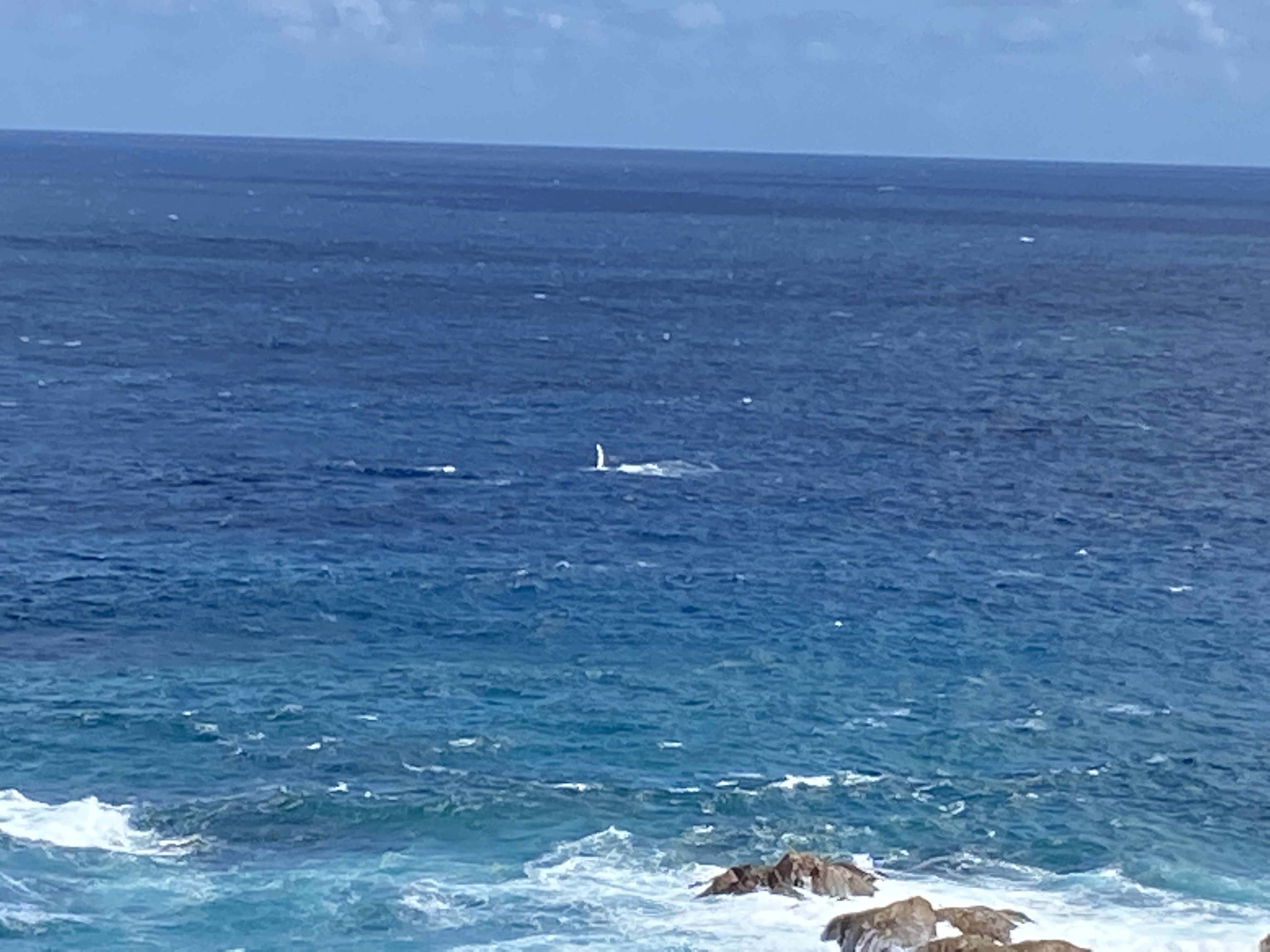 About 1 1/2 km past the seat, we dropped down the the beach at Three Bears, ascending back up to the path after a short 1/2 km walk along it. From there just over a km to another rest, again facing straight into the strong sou’wester and another 1 1/2 km to Sugarloaf Rock. Just before reaching the rock we were treated to an amazing display of breaching and fluke and fin slapping by three whales! It started when I pointed out what I thought was a bombie to Al but then we saw the whales playing. We watched them for about 500 m and then stood for probably another 10 minutes very close to Sugarloaf. It was the closest we had ever been to whales playing – so close we could hear the sound of their fins slapping the water! We had been seeing random splashes for a few days but it was hard to make anything out is the north westerlies we’ve been walking into so we think we have probably been seeing a lot of them without knowing it…