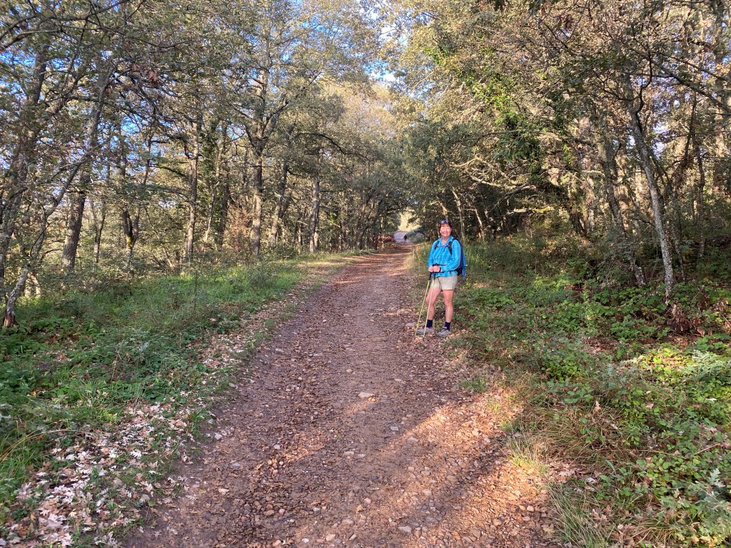 In complete contrast to the last couple of days, most of today was through forest, mostly oak but some pine. After the steep ascent, we passed a monument placed by the families of around 300 people who were executed in the first days of the Spanish civil war. From there we walked at or around the 1000m mark to the tiny hamlet of San Juan de Ortega, where we had our first real break of the day, just over 12km from Villafranca (we had stopped for a couple of minutes for Al to get some stones out of her shoes).