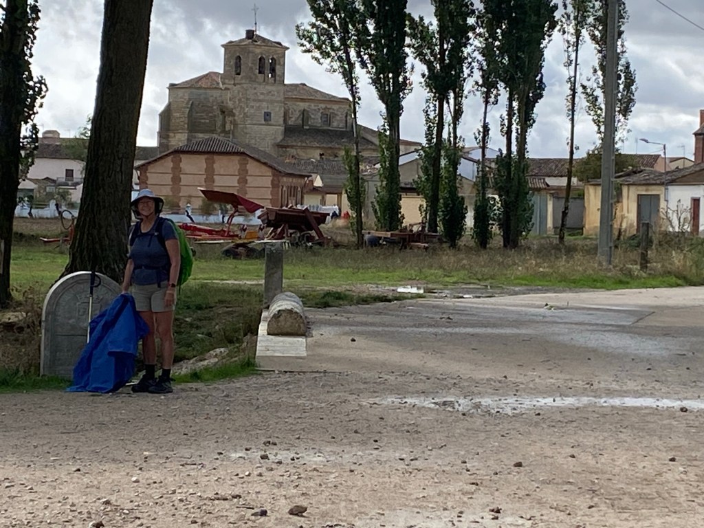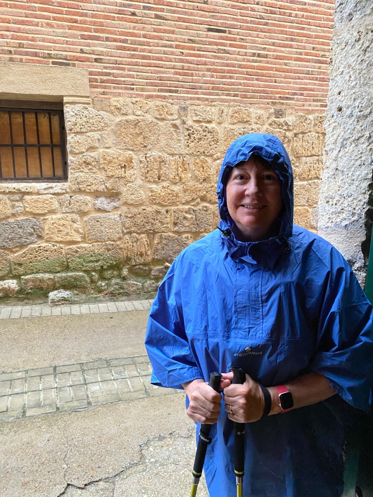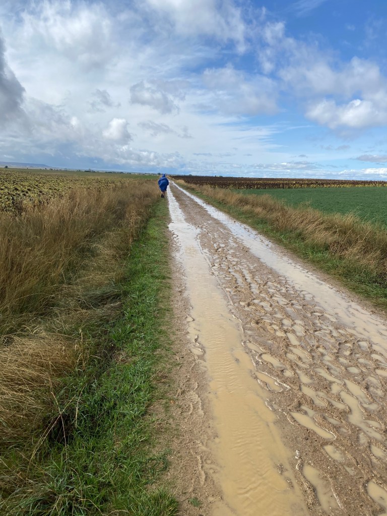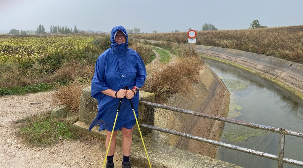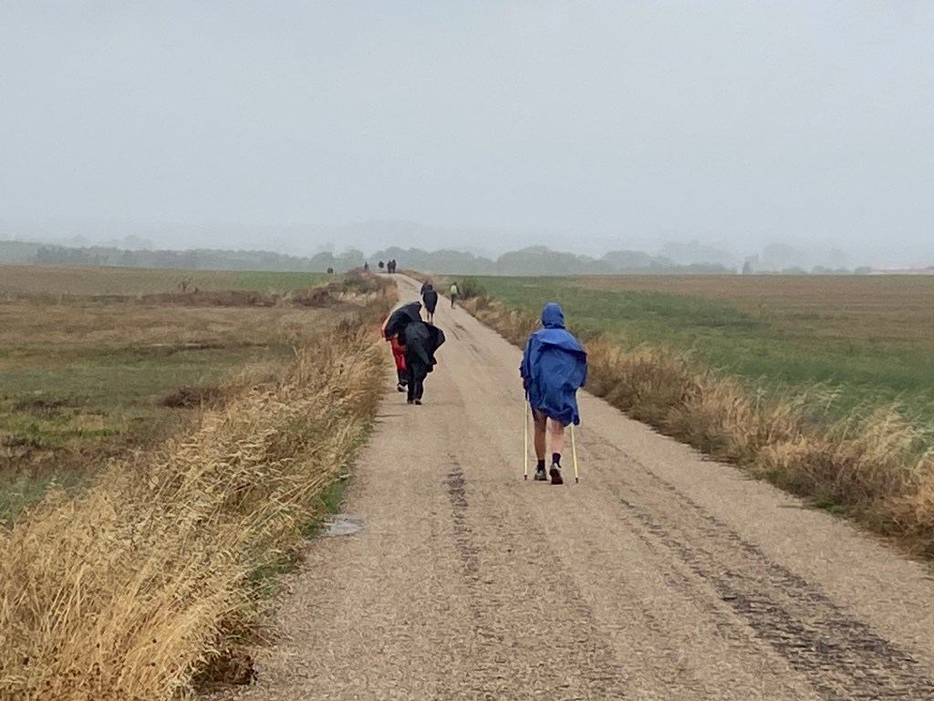 At this stage we were fairly confident we had seen the worst of the weather off – it was just before 12 noon when the rain was supposed to clear for the day. However, the forecast changed to extend the rain for another hour, so we set off hoping for the lighter rain we’d had earlier in the day. Well, about a km from Itero the heavens opened up for about an hour – our ponchos keep most of us dry but here are no shoes that can stay dry in those conditions so we squelched away for the next couple of hours as we made really good time into Boadilla del Camino. Just as the sun was coming out, and our ponchos had almost completely dried, a very wet “sunshower” drenched us again and turned the track into a couple of rivers – the water wasn’t pooling it was flowing down the hill!