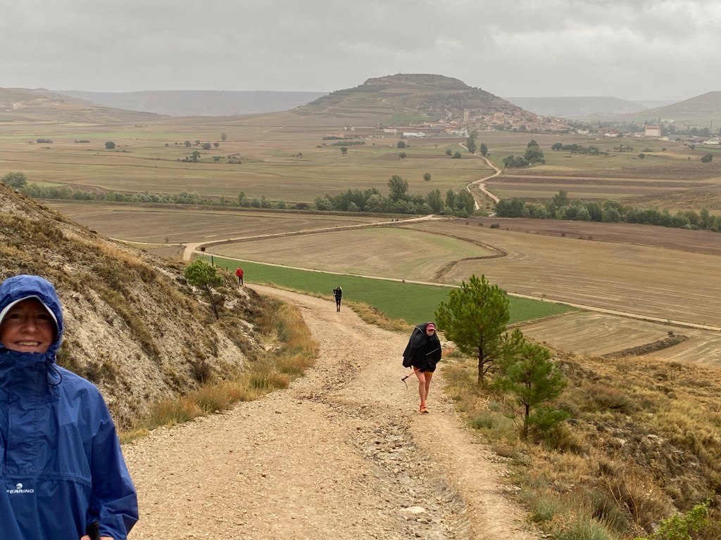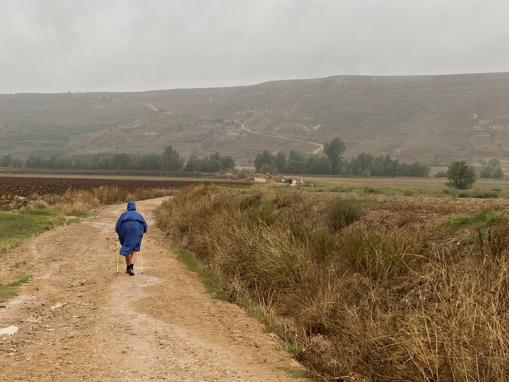 We knew it was going to be wet day, so we set of fully prepared and confident we could take what the elements threw at us. It was wet leaving town and crossing the río Odrilla valley between Castrojeriz and the climb up to the plateau but our confidence grew as the rain eased during the climb. Even more so as our geared dried out in the relatively short transit across the plateau and the descent down into the next valley. Although the path was very muddy in places (I’m talking about a couple of hundred grams of mud sticking to each shoe!) the rain was relatively light until about 5km from Itero de la Vega, reaching its peak just as we entered the village and found a coffee shop to rest and dry off in.