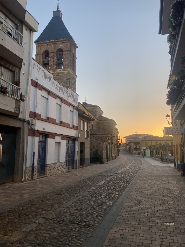 Santibáñez de Valdeiglesia also came up quickly but none of the cafes were open, so we pressed on. Just outside of the village the road turned to a wide brown track made up of fairly large stones, which always make the going tough. Added to the pain from below was the smell of a very active diary farm – talk about conflicting feelings! Walk fast and risk hurting our feet or walk slow and put up with the smell!