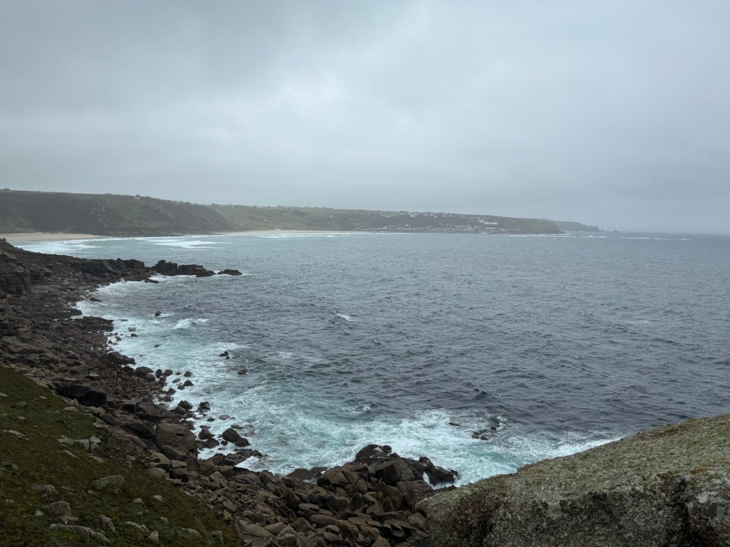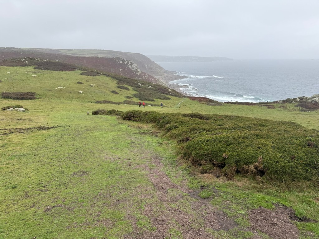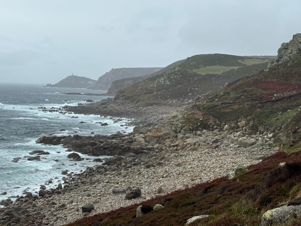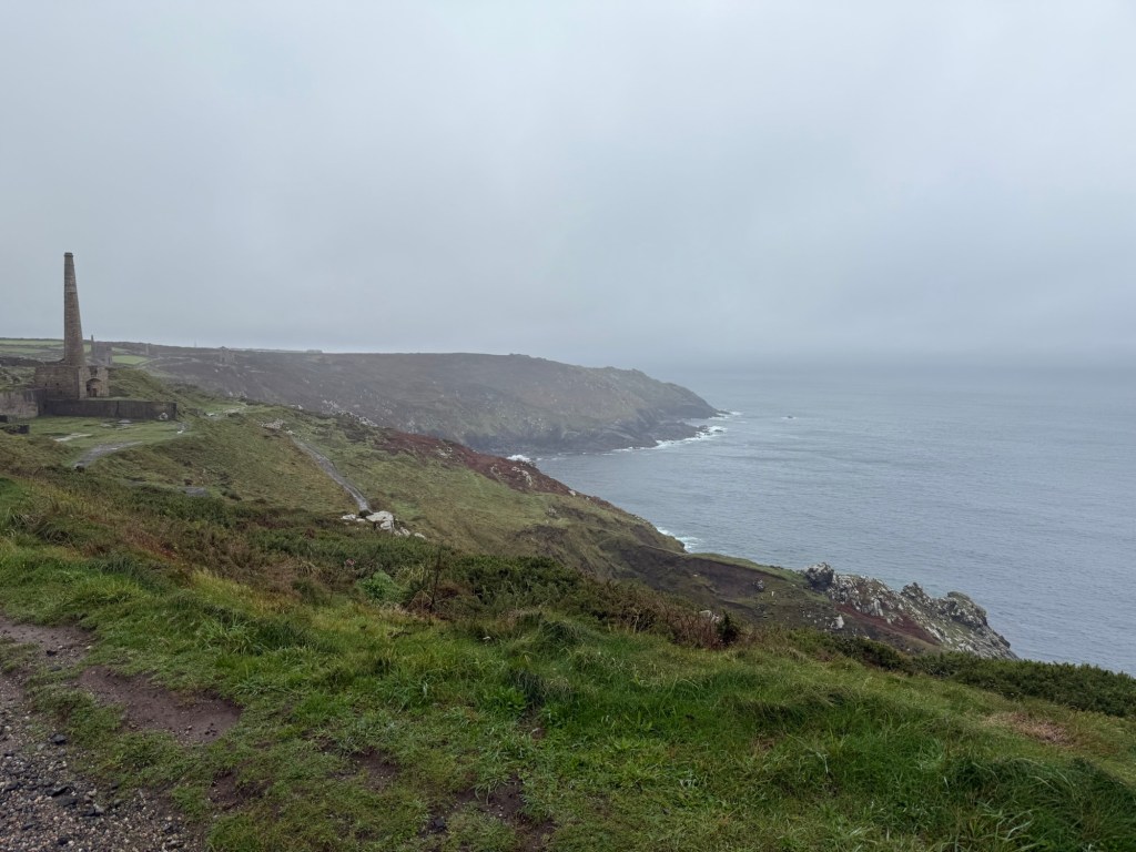 Stepping out into the mist after a lovely stay at TrewellardThe industrial landscape around Trewellard BottomsThe well restored Levant engine house, apparently used in the Poldark seriesAgain, evidence of a pretty industrial past heading southSouth Zawn, I think, looking southAnother well preserved relic, Crown MineKenidjack Valley, our first big descent and ascentLooking west from the same spot towards Cape CornwallThe ruins of Kenidjack castle from the south side of the valleyCape Cornwall lost in the mistIn between the two western ends of the UKRain setting as we head southAn easily identified mineshaft…… and a less obvious one!A bit of a scramble up after crossing the creek at Porth NansenLots of these today – at least the pictures of people falling off cliffs seem to be behind us!Land’s End in the distance – nice underfoot as the rain set in!Another scramble down to a slab bridgeThe “beach” has changed from ragged rocks to rounded bouldersCape Cornwall in the distance, looking northGwnver beach, Sennen Cove and Land’s EndSennen Cove looking past the two most optimistic swimming flags I’ve ever seen!Another scramble over the headland between Gwnver beach and Sennen CoveAt last, on the beach at Sennen CoveA Portuguese man o’war I thinkThe still dark skies looking northToday’s walk