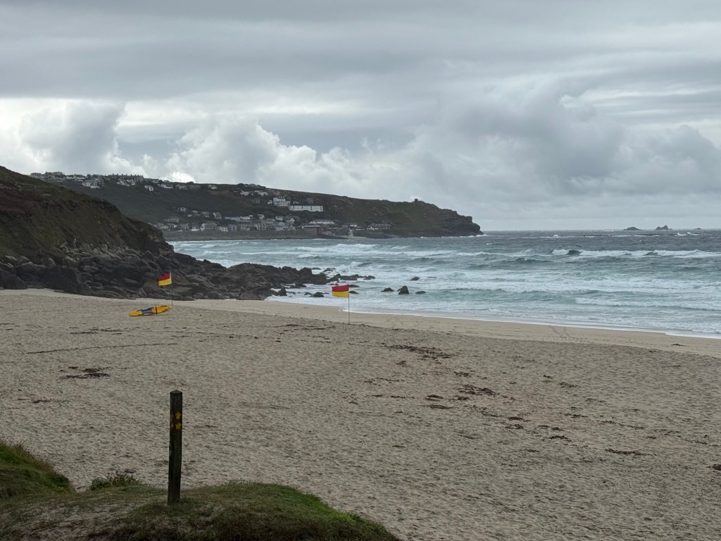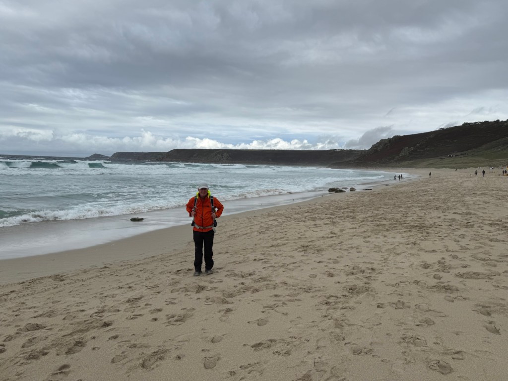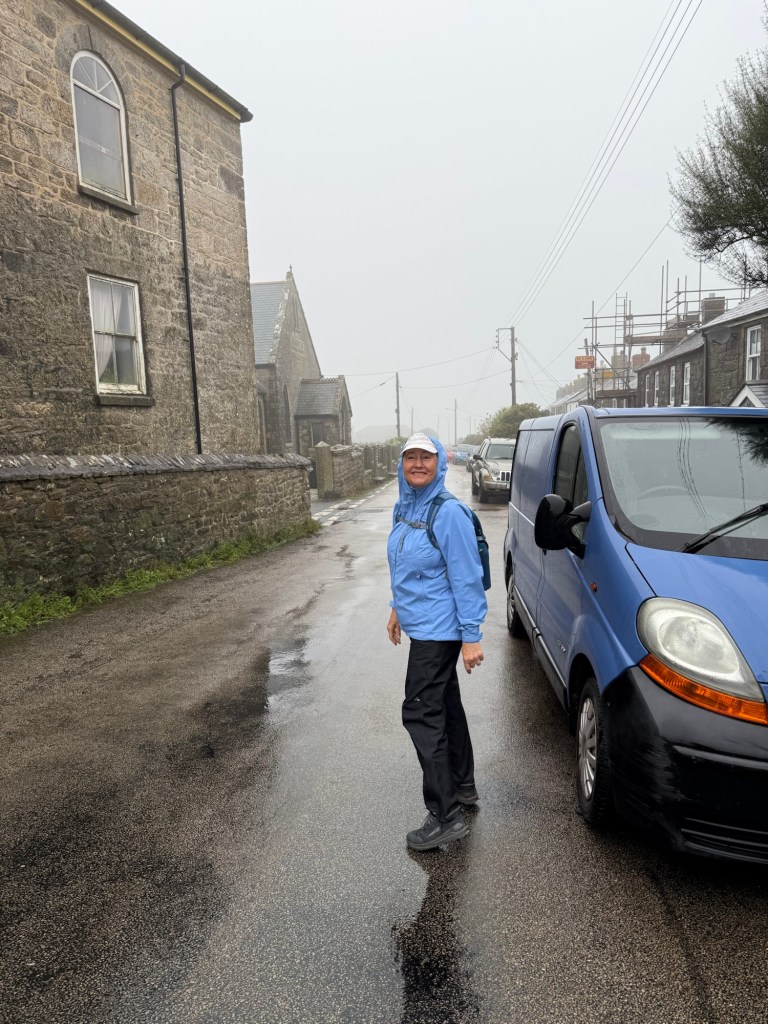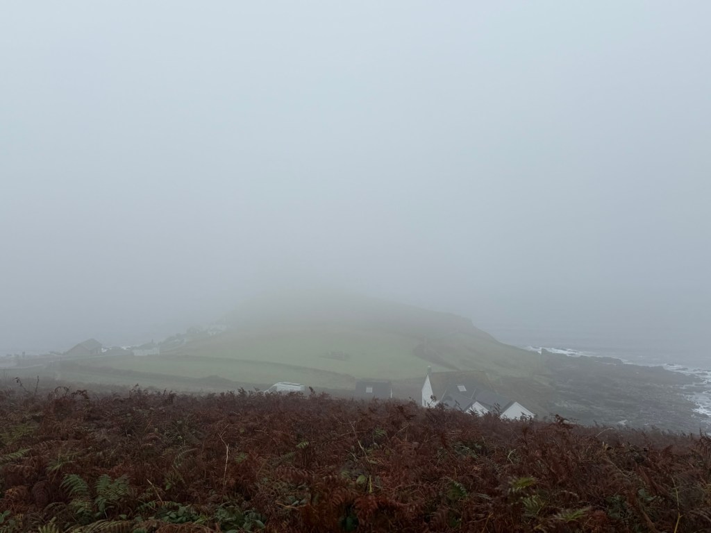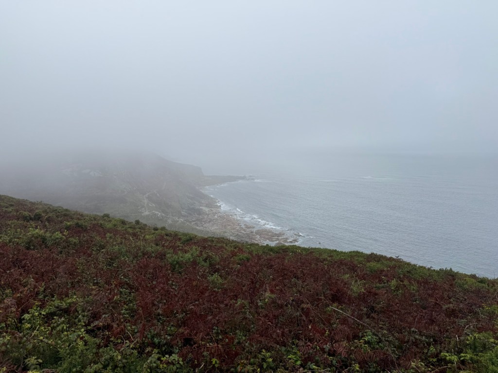 Stepping out into the mist after a lovely stay at TrewellardThe industrial landscape around Trewellard BottomsThe well restored Levant engine house, apparently used in the Poldark seriesAgain, evidence of a pretty industrial past heading southSouth Zawn, I think, looking southAnother well preserved relic, Crown MineKenidjack Valley, our first big descent and ascentLooking west from the same spot towards Cape CornwallThe ruins of Kenidjack castle from the south side of the valleyCape Cornwall lost in the mistIn between the two western ends of the UKRain setting as we head southAn easily identified mineshaft…… and a less obvious one!A bit of a scramble up after crossing the creek at Porth NansenLots of these today – at least the pictures of people falling off cliffs seem to be behind us!Land’s End in the distance – nice underfoot as the rain set in!Another scramble down to a slab bridgeThe “beach” has changed from ragged rocks to rounded bouldersCape Cornwall in the distance, looking northGwnver beach, Sennen Cove and Land’s EndSennen Cove looking past the two most optimistic swimming flags I’ve ever seen!Another scramble over the headland between Gwnver beach and Sennen CoveAt last, on the beach at Sennen CoveA Portuguese man o’war I thinkThe still dark skies looking northToday’s walk