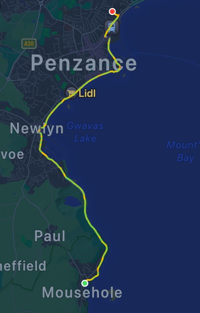 Today’s walk was a small one on the western side from Mousehole through Newlyn to just on the far side of Penzance. Unlike Mousehole, Newlyn and Penzance are very much working ports, are a bit worse for wear and tear and not nearly as pretty but it was (still is) another beautiful day in a great part of the world.