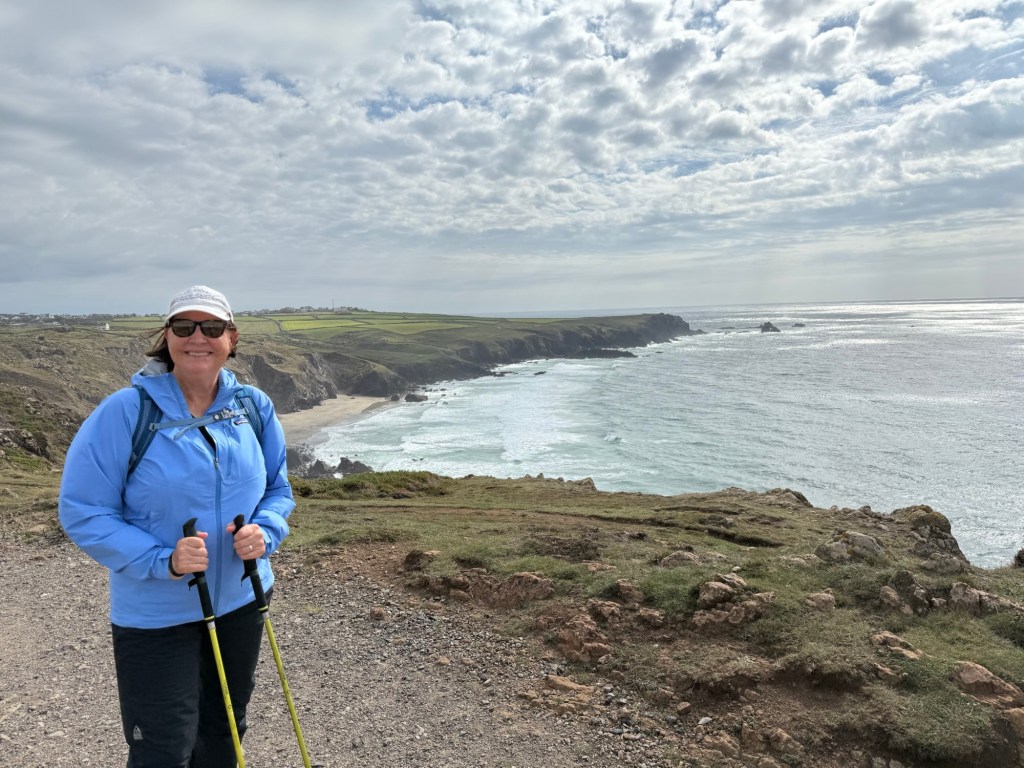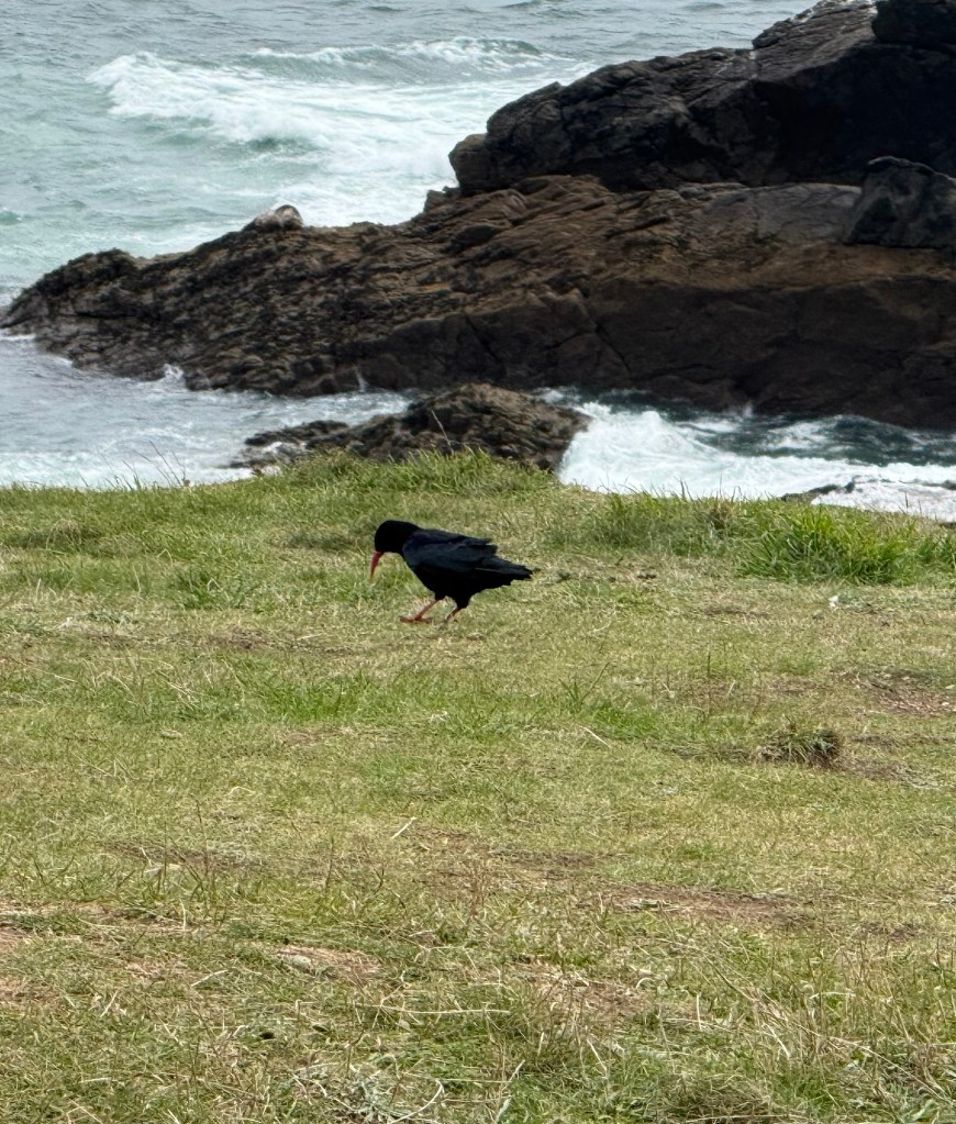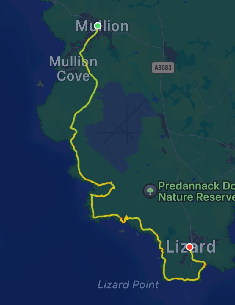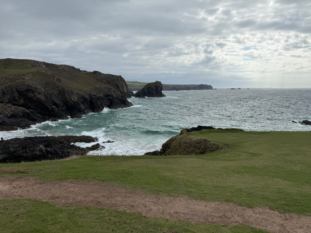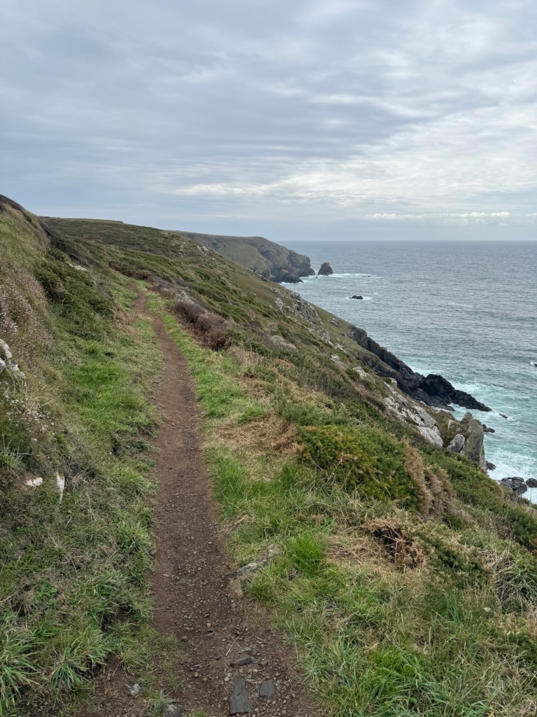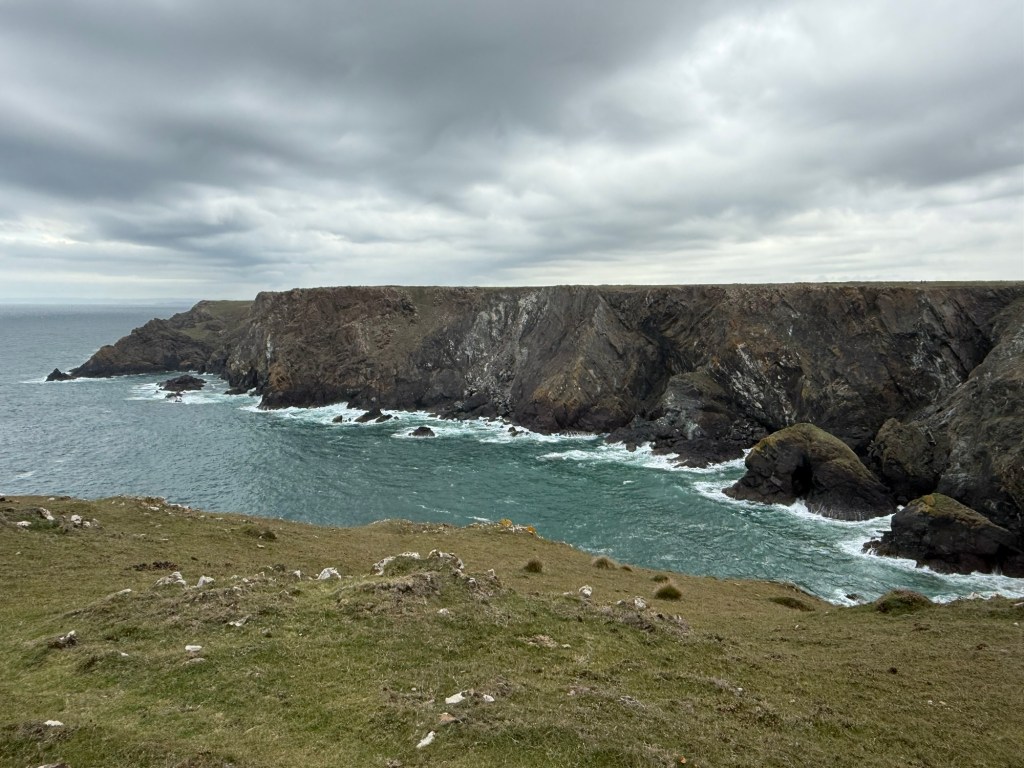 The rain dried up as we connected with the path and we had great walking on a grassy field with no distinct track all the way to a cove called Gew-Graze. Unfortunately, as happened again later near Kynance Cove, there were no markers to point out the path down into the gorge. We had a couple of goes to try to find it, but they all looked pretty precipitous so we took a higher path inland to try to find a better way. You can see on the map of today’s walk the I took us a bit “off piste”!